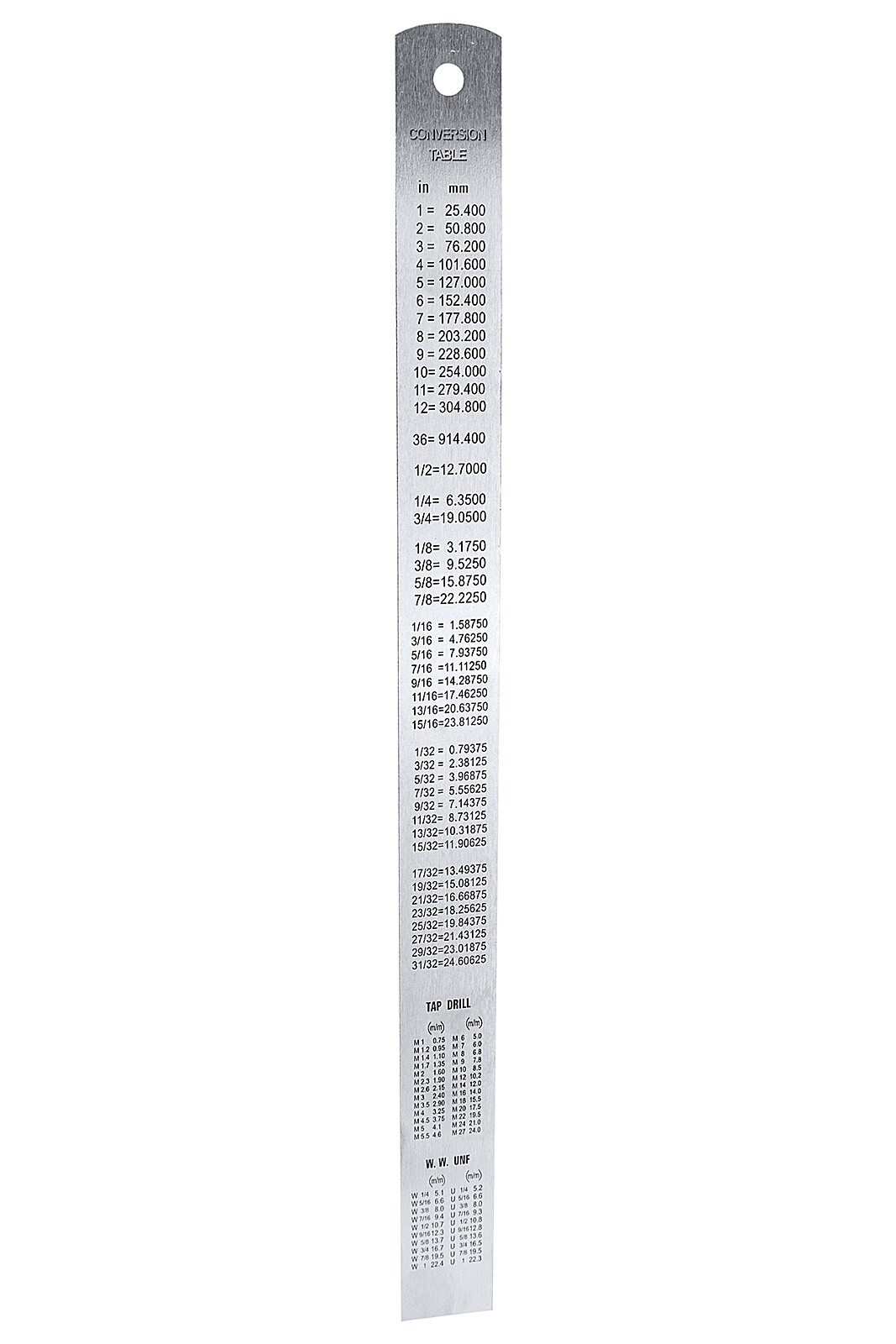 Pravítko je vyrobené z nerezovej ocele , čo zaručuje jeho dlhú životnosť a odolnosť proti korózii. Stupnica je milimetrová a je umiestnená na oboch okrajoch . Na zadnej strane nájdete praktickú prevodnú tabuľku hodnôt závitov.