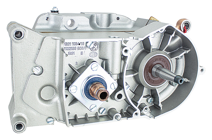 Polomor je zložený, kľukový hriadeľ aj prevodovka sú uložené a vymedzené proti pohybu, nasadené gufera.