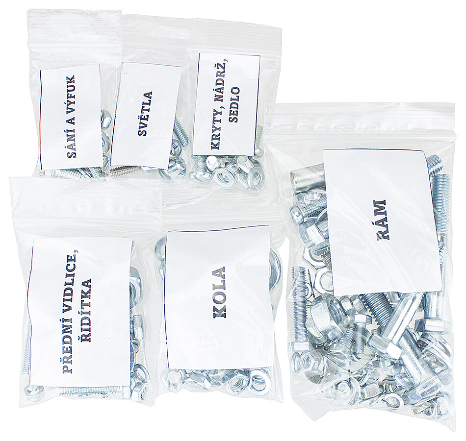 1. RÁM - spojovací materiál na uchytenie motora, zadného blatníka so svetlom, filtra, klinky, nity štítku, uchytenie indukčnej cievky atď.