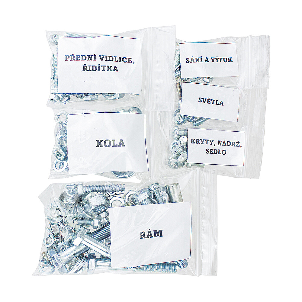 Sada je rozdelená do kategórií podľa jednotlivých častí motocykla, čo výrazne uľahčuje orientáciu a montáž: