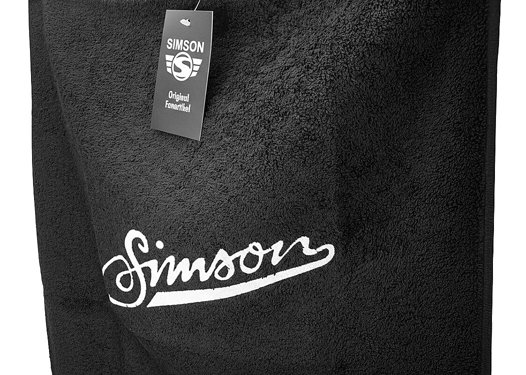 Čierny bavlnený uterák s motívom SIMSON. Materiál zo 100% bavlny zaisťuje vysokú savosť a komfort pri používaní.