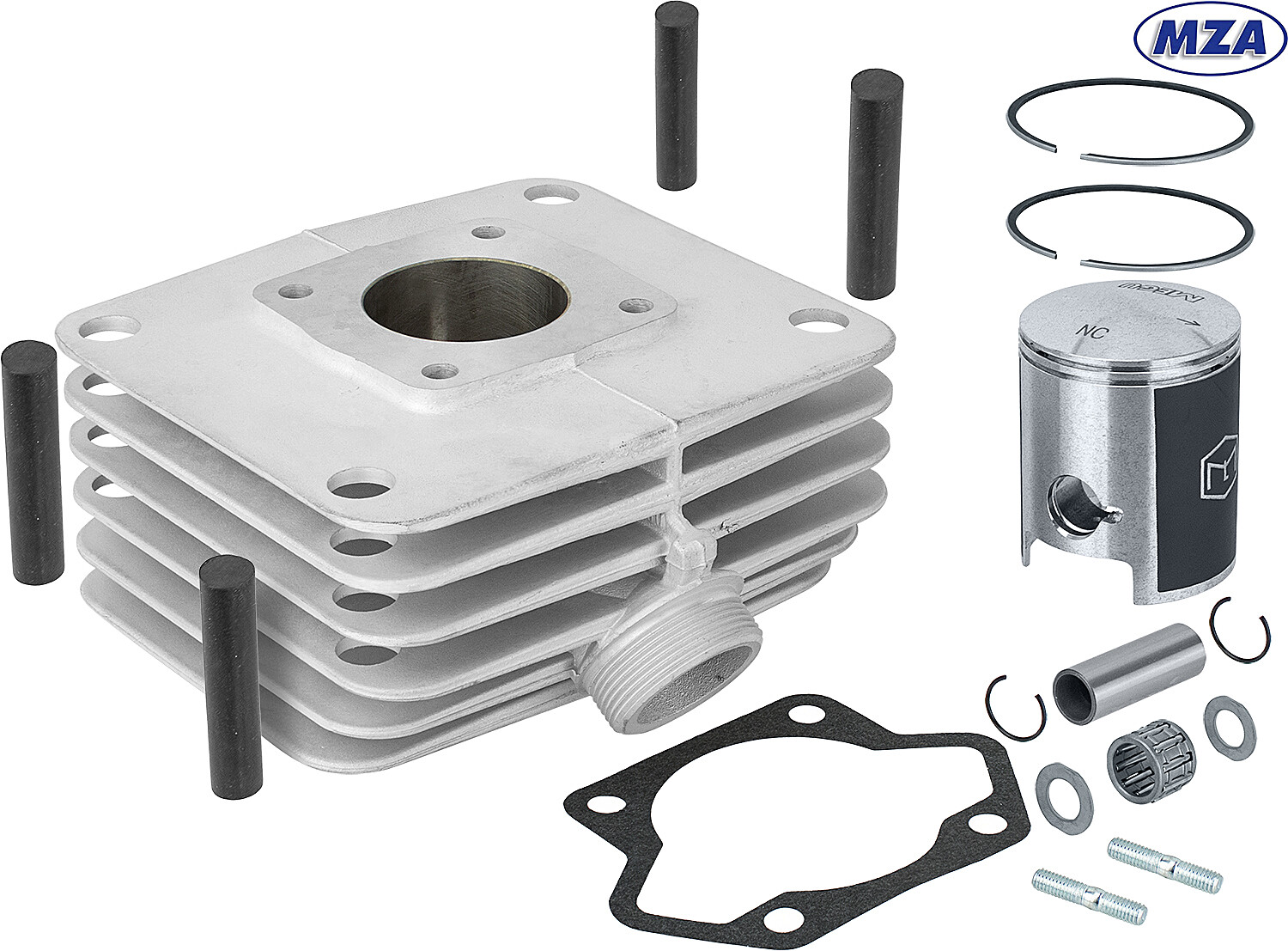 Valec Simson 70 ccm pre modely S51, S70, SR80 s povlakom Nikasil od výrobcu MZA v kompletnej sade. Valec nemá liatinovú vložku, tá je nahradená niklo-kremíkovo-karbidovou povrchovou úpravou Nikasil nanesenou priamo na valec, ktorá sa používa pri moderných závodných motoroch. Zabezpečuje lepšie klzné vlastnosti, lepší odvod tepla, vysoký kilometrový nájazd, nižšiu hmotnosť a krátku dobu zábehu. Prechody kanálov sú upravené na zlepšenie výkonu. Pred montážou piestu skontrolujte medzeru piestnych krúžkov (predpísaná medzera je približne 0,2–0,3 mm).